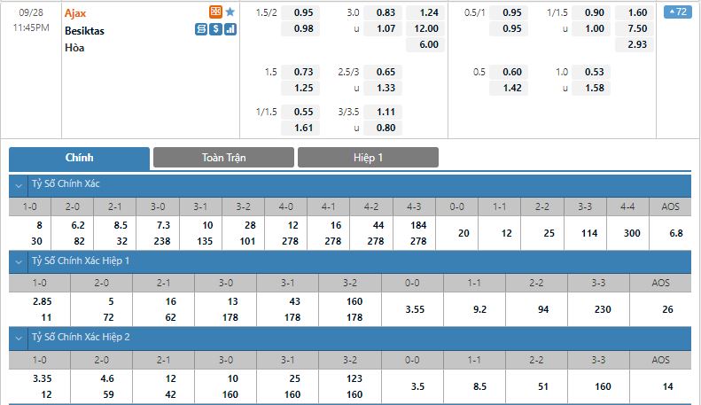- Kèo tỉ số hiệp 1: Ajax 2-0 Besiktas