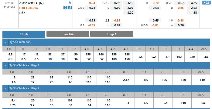 Bảng tỷ lệ kèo trực tuyến trận đấu Alashkert vs HJK Helsinki: