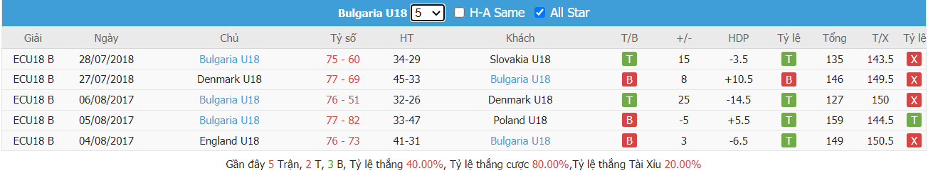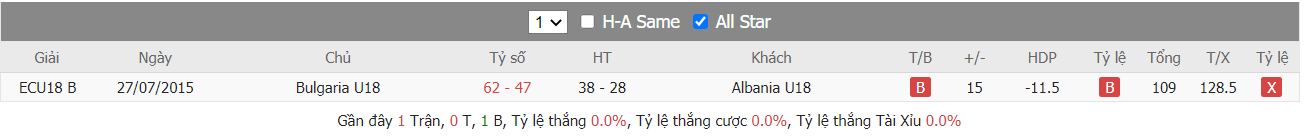 Thống kê cho thấy đây cứ trung bình mỗi trận sau tổng số 10 trận ra sân gần nhất Bulgaria U18 cũng đều duy trì được sự phòng khoáng trong lối chơi khi mà trên hàng công đã ghi được trung bình tới 85 điểm mỗi trận và cũng đã để đối thủ bỏ vào rổ nhà trung bình tới 83 điểm mỗi. Từ đó dẫn tới 6 trên 10 trận đấu kể trên đều đã khép lại với các kết quả chung cuộc nổ tài. Vậy nên khả năng bùng nổ tỷ số ở trận tới cũng rất đáng được kỳ vọng khi mà cũng đã tới 7 trên 10 trận ra sân gần nhất của đội chủ nhà Albania U18 cũng đều đã vượt qua mức kèo niêm yết theo TLCA. Đồng thời Albania U18 cũng đã ghi được trung bình tới 87 điểm mỗi trận sau tổng số 10 trận ra sân gần nhất.