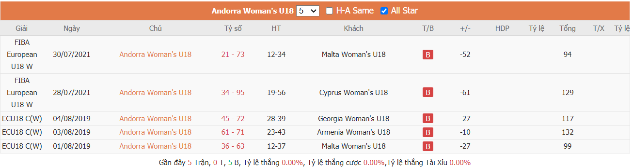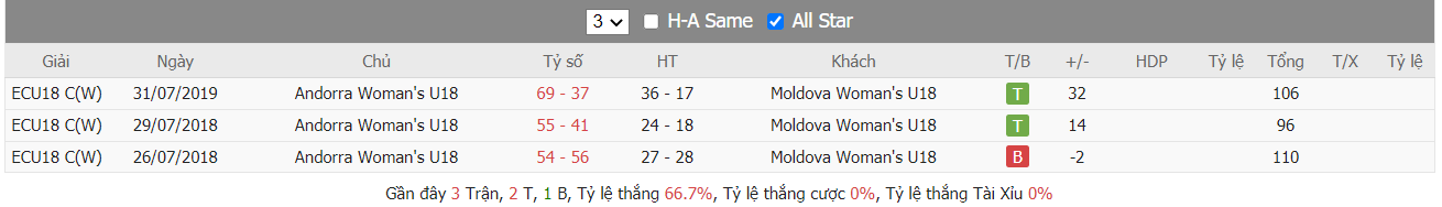 Thống kê cho thấy đây cứ trung bình mỗi trận sau tổng số 10 trận ra sân gần nhất Moldova U18 cũng đều duy trì được sự phòng khoáng trong lối chơi khi mà trên hàng công đã ghi được trung bình tới 85 điểm mỗi trận và cũng đã để đối thủ bỏ vào rổ nhà trung bình tới 83 điểm mỗi. Từ đó dẫn tới 6 trên 10 trận đấu kể trên đều đã khép lại với các kết quả chung cuộc nổ tài. Vậy nên khả năng bùng nổ tỷ số ở trận tới cũng rất đáng được kỳ vọng khi mà cũng đã tới 7 trên 10 trận ra sân gần nhất của Andorra U18 cũng đều đã vượt qua mức kèo niêm yết theo TLCA. Đồng thời Andorra U18 cũng đã ghi được trung bình tới 87 điểm mỗi trận sau tổng số 10 trận ra sân gần nhất.