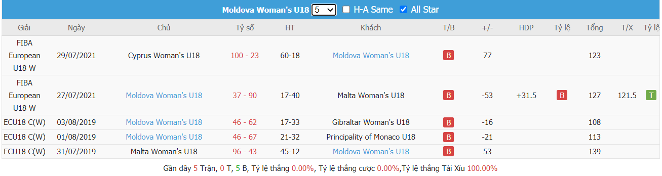 Bảng tỷ lệ kèo Andorra U18 vs Moldova U18