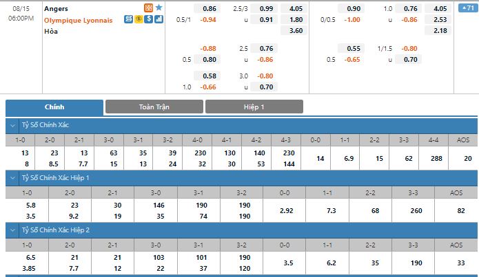 Bảng tỷ lệ kèo trực tuyến trận đấu Angers vs Lyon: