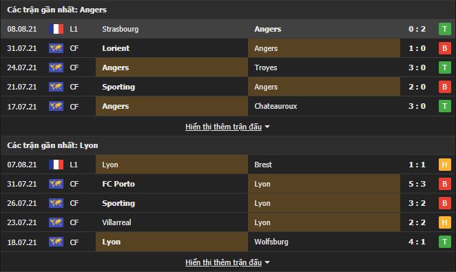 Phong độ gần đây Angers vs Lyon: