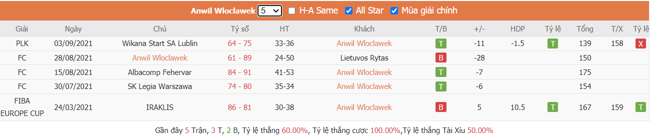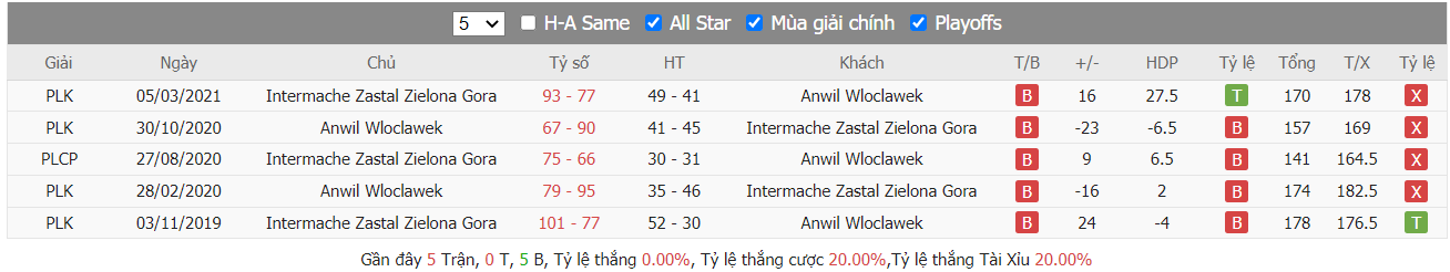 Phong độ gần đây Anwil Włocławek vs Zastal Zielona Góra