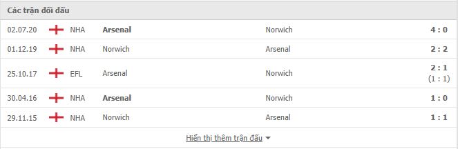 Thành tích đối đầu Arsenal vs Norwich