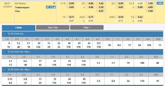 Bảng tỷ lệ kèo trực tuyến trận đấu AS Roma vs Trabzonspor: