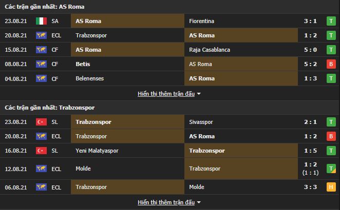 Với chất lượng đội hình được tăng cường đáng kể trong kỳ chuyển nhượng hè vừa rồi và được dẫn dắt bởi vị chiến lược gia tài năng Mourinho, AS Roma thừa tự tin vượt qua Trabzonspor. Sức mạnh của AS Roma đã được chứng minh khi đánh bại đối thủ với tỉ số 2-1 trong trận lượt đi. Kèo châu Á chủ nhà chấp 1/1.5 và tài xỉu 2.5/3, chọn đội chủ nhà và xỉu đặt kèo hợp lí hơn cả.