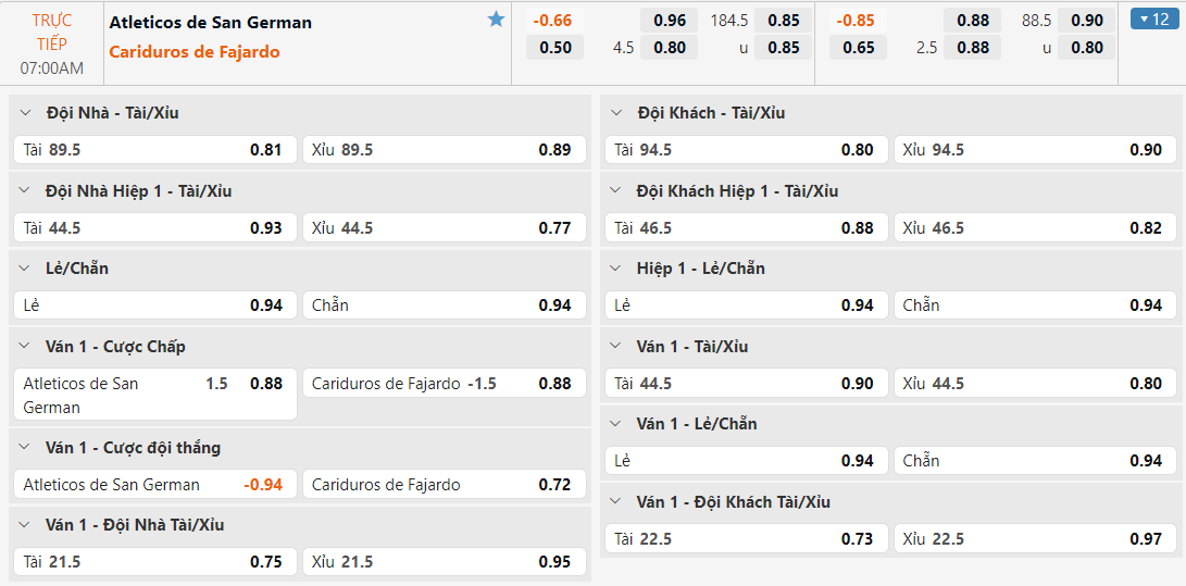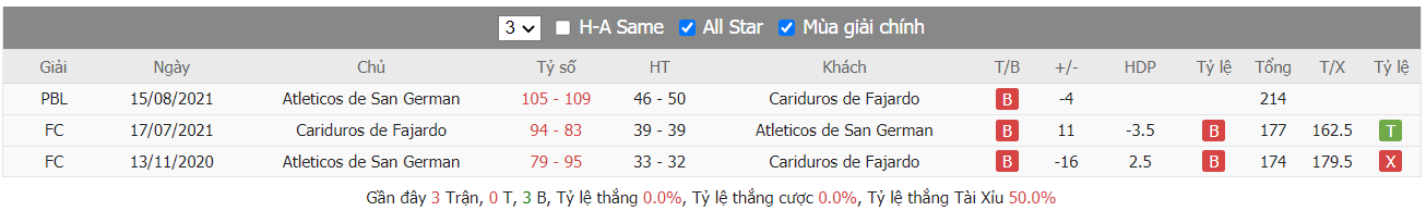 Bảng tỷ lệ kèo Atléticos de San Germán vs Cariduros Fajardo