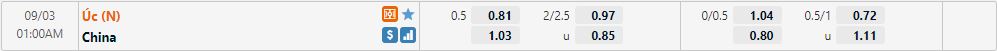 Bảng tỷ lệ kèo trực tuyến trận đấu Australia vs Trung Quốc