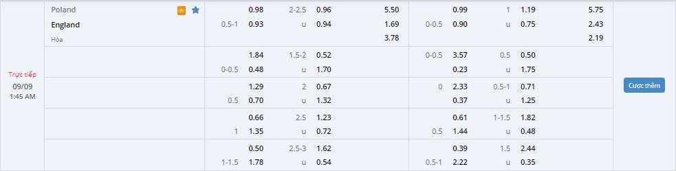 Bảng tỷ lệ kèo bóng đá Ba Lan vs Anh