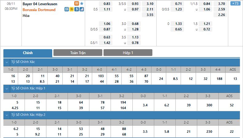 Bảng tỷ lệ kèo bóng đá Bayer Leverkusen vs Borussia Dortmund