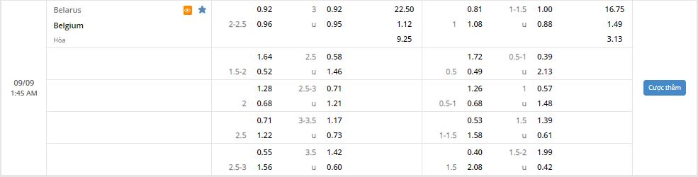 Bảng tỷ lệ kèo trực tuyến trận đấu Belarus vs Bỉ