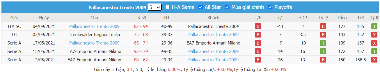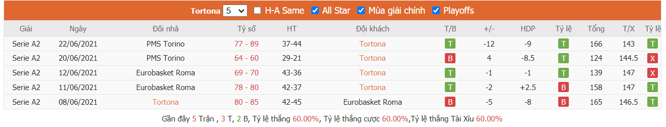 Thống kê cho thấy cứ trung bình mỗi trận trong tổng số 5 trận sân nhà gần nhất, Trento đều đã ghi được trung bình tới 88 điểm và cũng đã để để mất trung bình tới 85 điểm. Từ đó dẫn tới đã có tới 6 trên tổng số 9 trận sân nhà đã qua của Trento đều đã vượt mức niêm yết kèo tài xỉu theo mức TLCA. Vậy nên khả năng bùng nổ tỉ số ở trận đấu tới càng được kỳ vọng hơn khi mà đã có tới 6 trên tổng số 8 trận sân khách đã qua đội khách Bertram Tortona cũng đều đã để mất nhiều hơn tới 85 điểm mỗi trận.