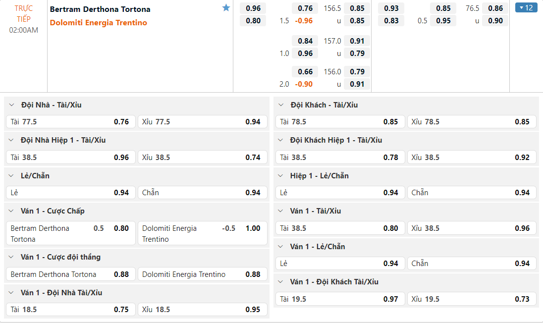 Bảng tỷ lệ kèo Bertram Tortona vs Trento