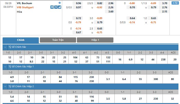 Bảng tỷ lệ kèo trực tuyến trận đấu Bochum vs VfB Stuttgart:
