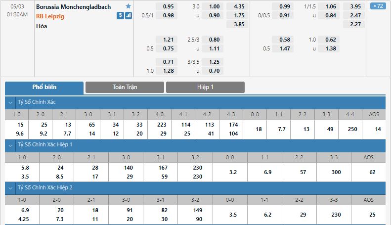 Bảng tỷ lệ kèo trực tuyến trận đấu Borrussia Monchengladbach vs RB Leipzig