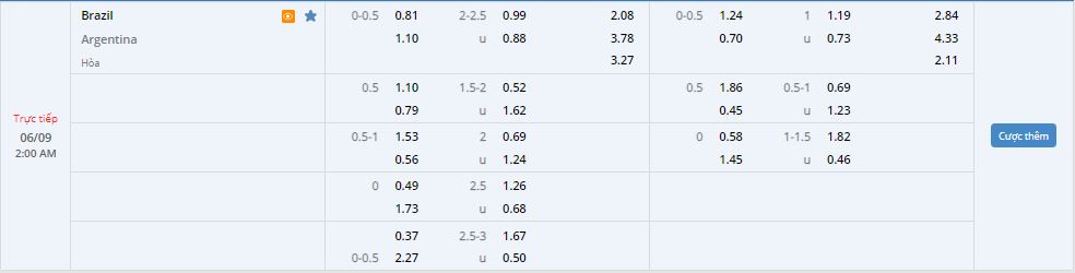 Bảng tỷ lệ kèo trực tuyến trận đấu Brazil vs Argentina