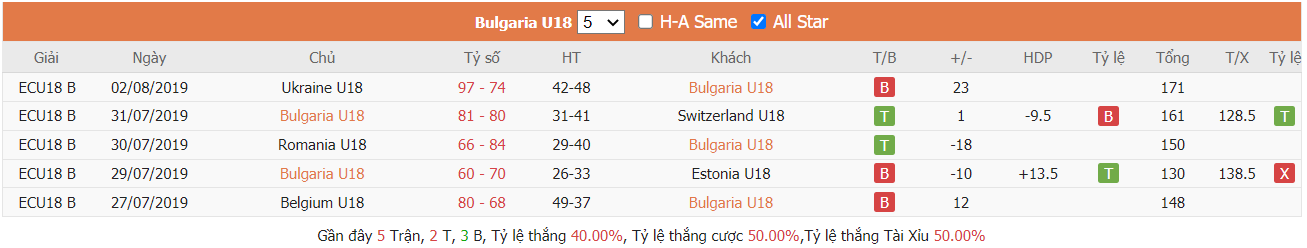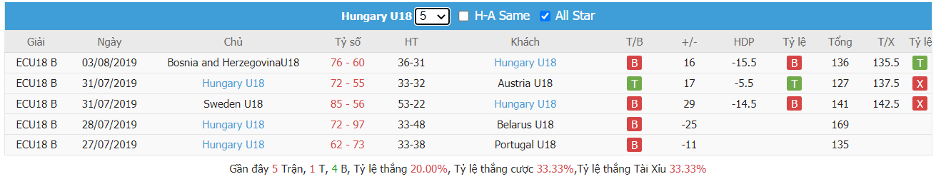 Thống kê cho thấy đây cứ trung bình mỗi trận sau tổng số 10 trận ra sân gần nhất Bulgaria U18 cũng đều duy trì được sự phòng khoáng trong lối chơi khi mà trên hàng công đã ghi được trung bình tới 85 điểm mỗi trận và cũng đã để đối thủ bỏ vào rổ nhà trung bình tới 83 điểm mỗi. Từ đó dẫn tới 6 trên 10 trận đấu kể trên đều đã khép lại với các kết quả chung cuộc nổ tài. Vậy nên khả năng bùng nổ tỷ số ở trận tới cũng rất đáng được kỳ vọng khi mà cũng đã tới 7 trên 10 trận ra sân gần nhất của Hungary U18 cũng đều đã vượt qua mức kèo niêm yết theo TLCA. Đồng thời Hungary U18 cũng đã ghi được trung bình tới 87 điểm mỗi trận sau tổng số 10 trận ra sân gần nhất.