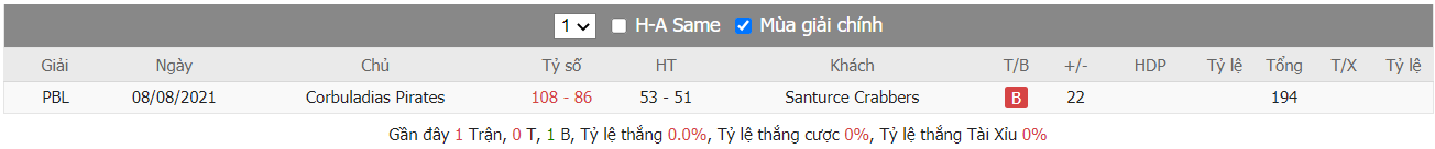 Với lợi thế được ra sân ngay trên sân nhà ở trận đấu tới, Piratas de Quebradillas vẫn được đánh giá là sự lựa chọn tiềm năng dành cho giới đầu tư khi đã có tới 5 trận thắng kèo theo TLCA trên 8 trận ra sân gần nhất trong khi Cangrejeros de Santurce chỉ có vỏn vẹn 4 lần đem lại được kết quả có lợi cho người trên 10 trận ra sân gần nhất của đội bóng này. Vậy nên giới đầu tư có thể cân nhắc lựa chọn cửa cược Piratas de Quebradillas để có được mức tỷ lệ ăn thưởng cao nhất.