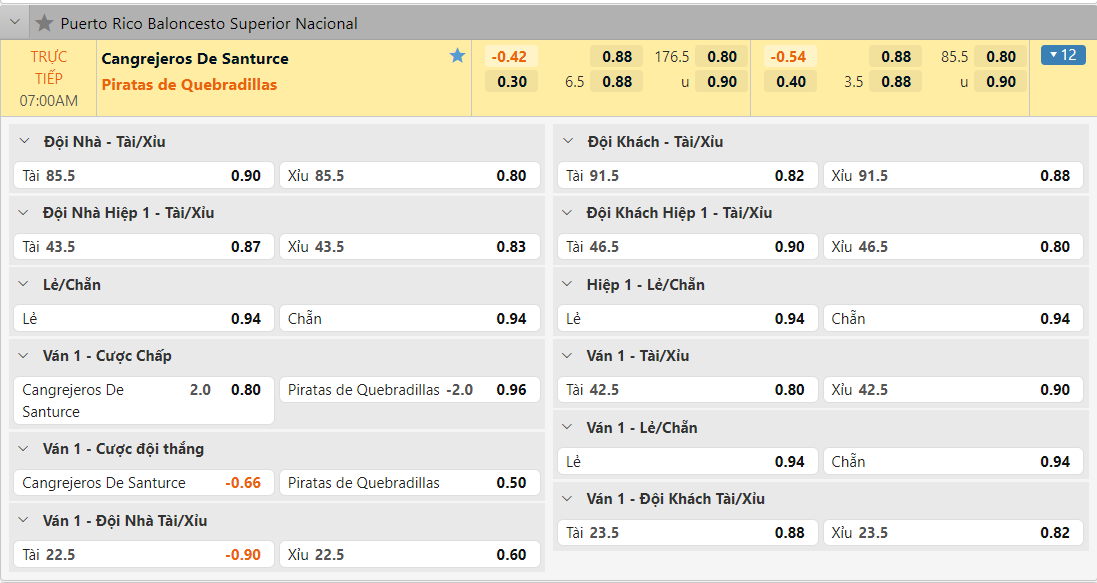 Bảng tỷ lệ kèo Cangrejeros de Santurce vs Piratas de Quebradillas