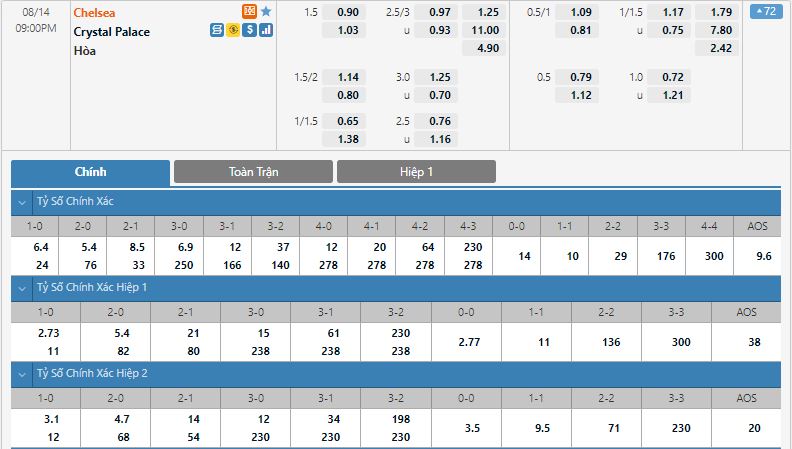 Bảng tỷ lệ kèo bóng đá Chelsea vs Crystal Palace