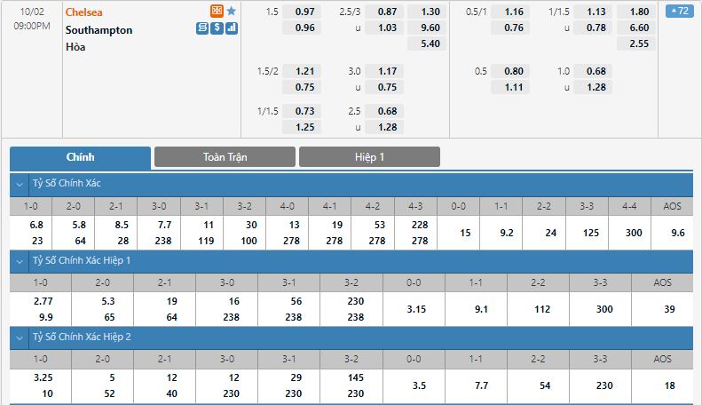 - Kèo tỉ số hiệp 1: Chelsea 1-0 Southampton