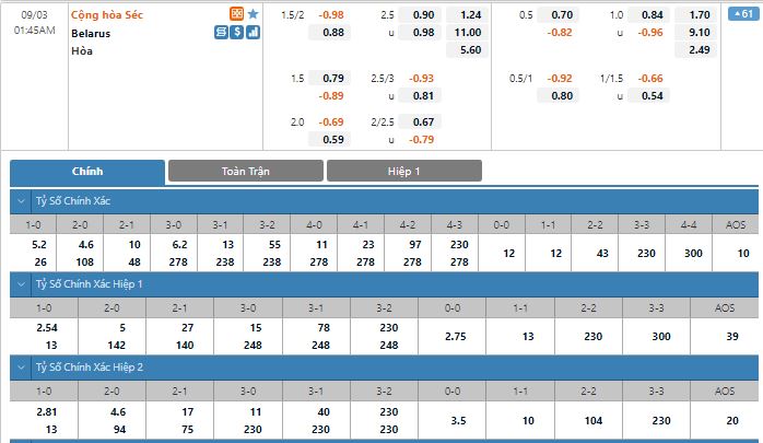 Bảng tỷ lệ kèo trực tuyến trận đấu Cộng hòa Séc vs Belarus: