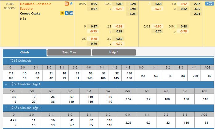 Bảng tỷ lệ kèo trực tuyến trận đấu Consadole Sapporo vs Cerezo Osaka: