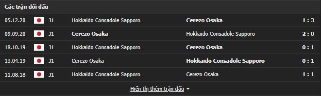 Thành tích đối đầu Consadole Sapporo vs Cerezo Osaka: