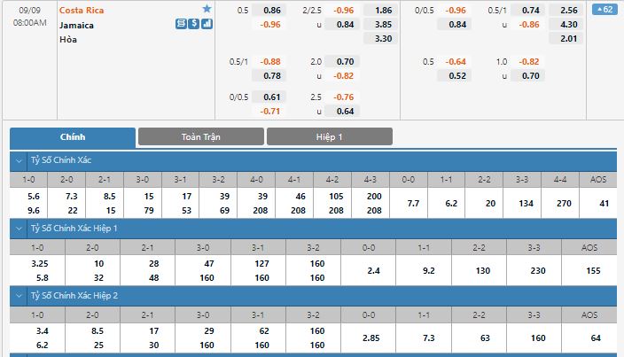 Bảng tỷ lệ kèo trực tuyến trận đấu Costa Rica vs Jamaica: