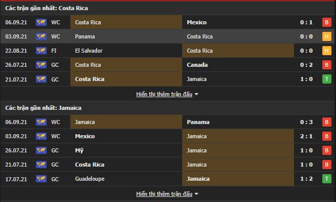 Phong độ gần đây Costa Rica vs Jamaica: