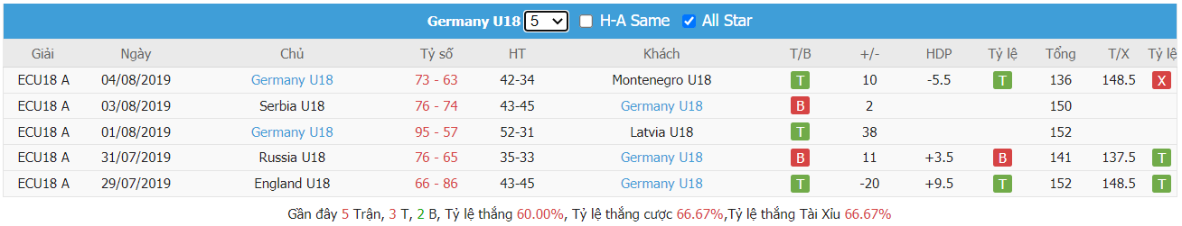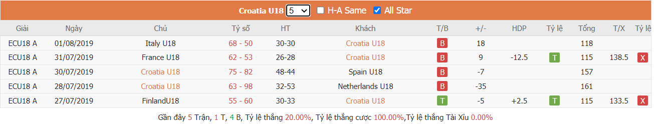 Thống kê cho thấy đây cứ trung bình mỗi trận sau tổng số 10 trận ra sân gần nhất Germany U18 cũng đều duy trì được sự phòng khoáng trong lối chơi khi mà trên hàng công đã ghi được trung bình tới 85 điểm mỗi trận và cũng đã để đối thủ bỏ vào rổ nhà trung bình tới 83 điểm mỗi. Từ đó dẫn tới 6 trên 10 trận đấu kể trên đều đã khép lại với các kết quả chung cuộc nổ tài. Vậy nên khả năng bùng nổ tỷ số ở trận tới cũng rất đáng được kỳ vọng khi mà cũng đã tới 7 trên 10 trận ra sân gần nhất của đội chủ nhà Croatia U18 cũng đều đã vượt qua mức kèo niêm yết theo TLCA. Đồng thời Croatia U18 cũng đã ghi được trung bình tới 87 điểm mỗi trận sau tổng số 10 trận ra sân gần nhất.