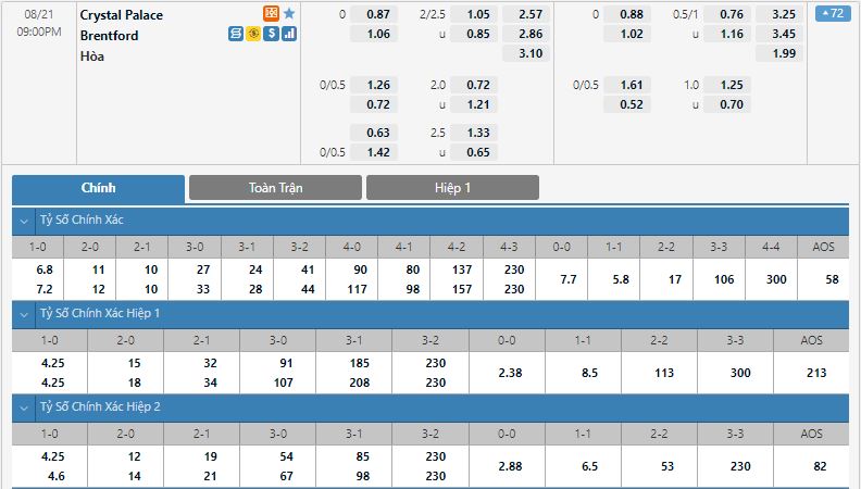 - Kèo tỉ số hiệp 2: Crystal Palace 1-0 Brentford