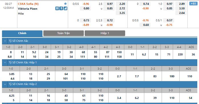 Bảng tỷ lệ kèo trực tuyến trận đấu CSKA Sofia vs Viktoria Plzen: