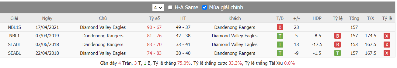 Thống kê về thành tích đối đầu của hai đội trong quá khứ, kết quả cho thấy không có được lợi thế sân bãi ở trận này Diamond Valley Eagles vẫn được đánh giá cao hơn hẳn khi đã thắng tới 5 trên 8 lần chạm trán gần nhất của hai bên kể từ 12/2018 cho tới nay, trong đó còn có tới 5 trận cũng được diễn ra trên sân nhà của Diamond Valley Eagles. Trong số đó ở lần chạm trán mới đây nhất hồi lượt trận mở màn trong mùa bóng mới, với lợi thế được ra sân ngay trên sân nhà Diamond Valley Eagles đã giành được chiến thắng 93 – 87 khi tiếp đón chính Dandenong Rangers. Như vậy với lợi thế được ra sân ngay trên sân nhà, Diamond Valley Eagles tiếp tục sẽ là sự lựa chọn sáng hơn hẳn khi mà Dandenong Rangers đã mang đến niềm vui cho các nhà đầu tư trong 4 trận ra sân mới đây nhất.