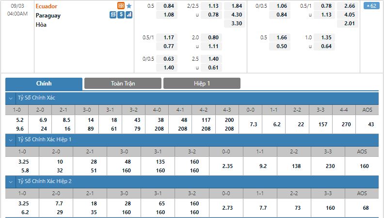 Bảng tỷ lệ kèo trực tuyến trận đấu Ecuador vs Paraguay