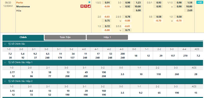 Bảng tỷ lệ kèo trực tuyến trận đấu FC Porto vs Moreirense:
