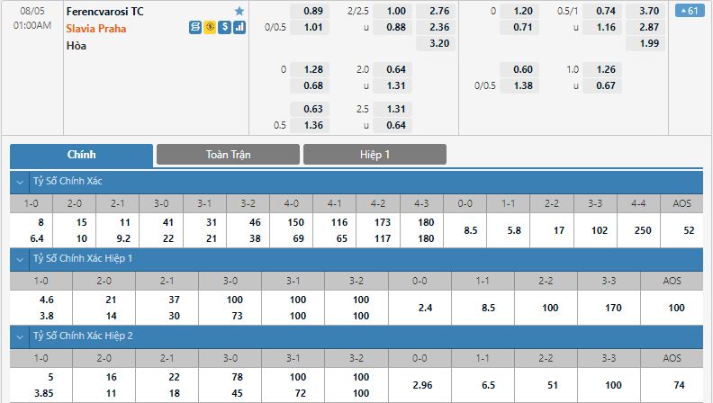 Bảng tỷ lệ kèo trực tuyến trận đấu Ferencvarosi TC vs Slavia Praha