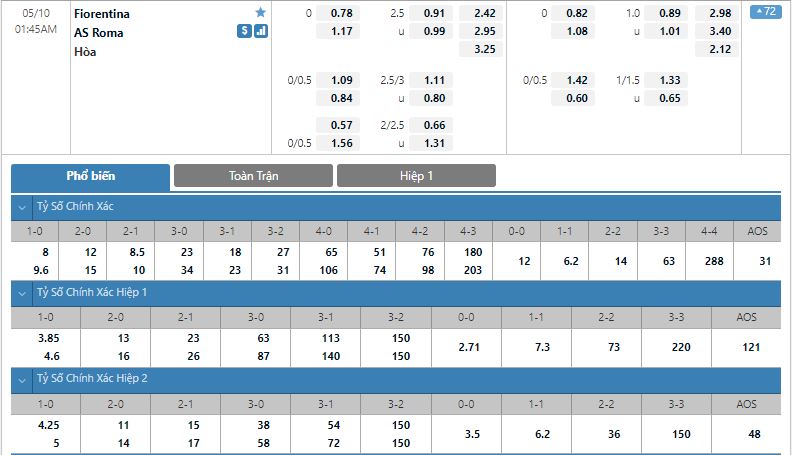 Bảng tỷ lệ kèo trực tuyến trận đấu Fiorentina vs AS Roma