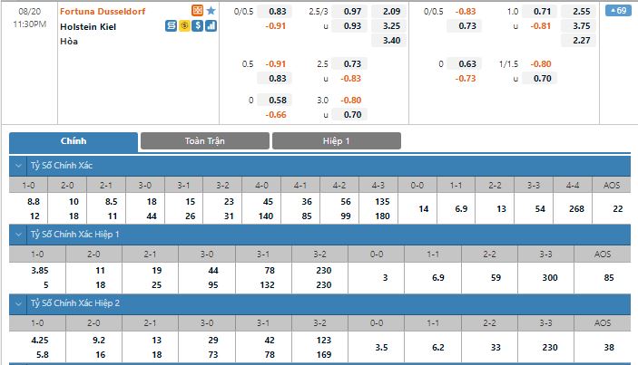 Bảng tỷ lệ kèo trực tuyến trận đấu Fortuna Dusseldorf vs Holstein Kiel:
