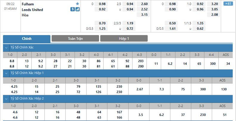 - Kèo tỉ số hiệp 1: Fulham 0-1 Leeds