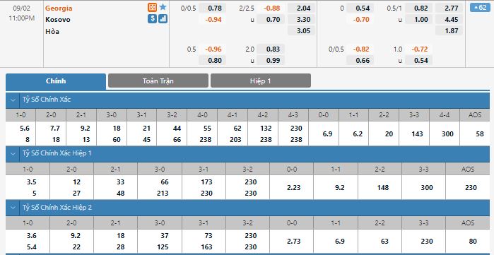 Bảng tỷ lệ kèo trực tuyến trận đấu Georgia vs Kosovo:
