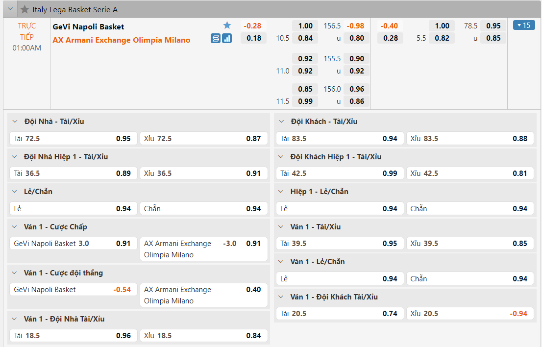 Bảng tỷ lệ kèo GeVi Napoli vs EA7-Emporio Armani Milano