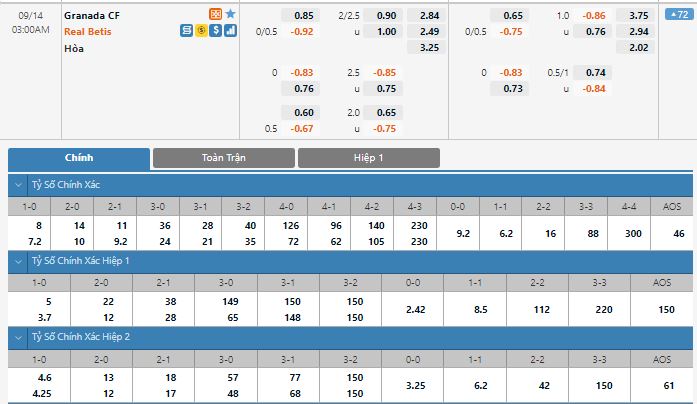 Bảng tỷ lệ kèo trực tuyến trận đấu Granada vs Real Betis:
