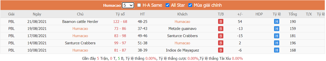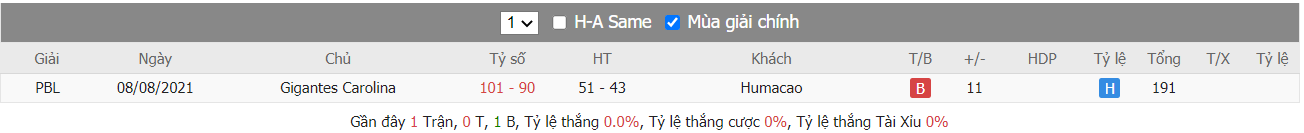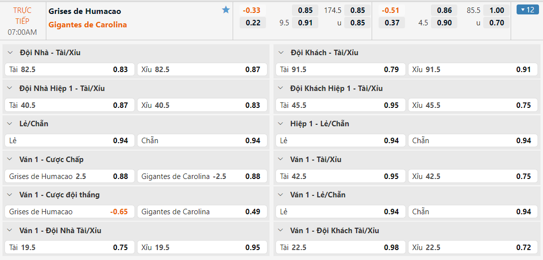 Bảng tỷ lệ kèo Grises de Humacao vs Gigantes de Carolina