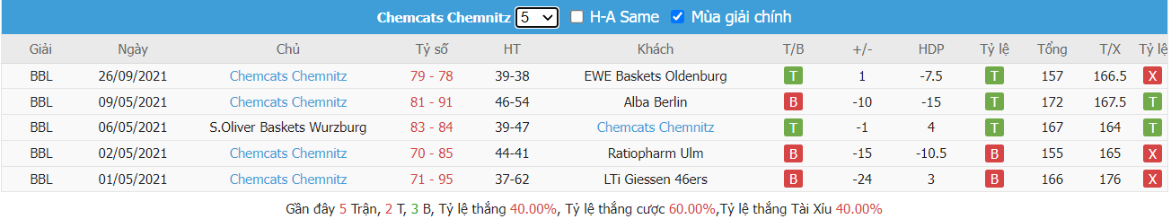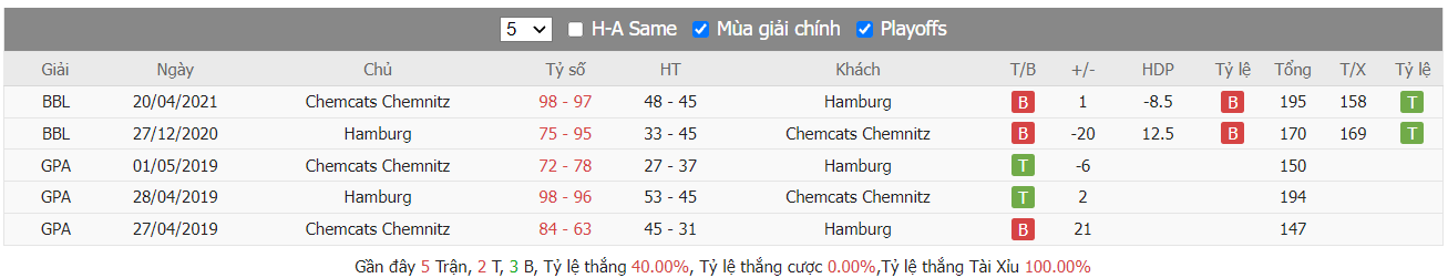 Thống kê cũng chỉ ra BV Chemnitz 99 cũng chỉ ghi được trung bình 115 điểm mỗi trận và cũng không duy trì được sự chắc chắn khi cũng đã để mất trung bình 115 điểm mỗi trận qua cả thảy 3 trận đón khách gần nhất. Như vậy dù được đánh giá cao ở trận tới nhưng BV Chemnitz 99 cũng không được tin tưởng sẽ ghi được nhiều điểm trước Hamburg. Trong khi đó với bất lợi về thành tích đối đầu và còn phải thi đấu trên sân khách nên Hamburg hoàn toàn không được đánh giá cao trong nhiệm vụ ghi nhiều điểm ở trận tới. Như vậy cửa xỉu vẫn là sự lựa chọn sáng hơn ở trận này, nhất là khi mà đã có tới 6 trên 7 trận gần nhất của Hamburg và 4 trên 5 trận so tài gần nhất của hai bên, tất cả cũng đã ghi nhận kết quả chung cuộc về xỉu.