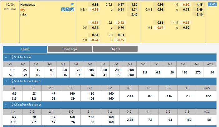 Bảng tỷ lệ kèo trực tuyến trận đấu Honduras vs USA: