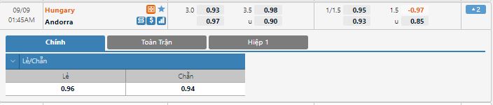 Bảng tỷ lệ kèo trực tuyến trận đấu Hungary vs Andorra: