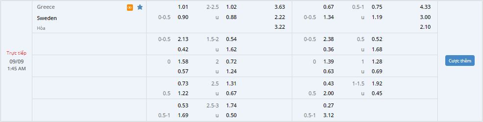 Bảng tỷ lệ kèo bóng đá Hy Lạp vs Thụy Điển