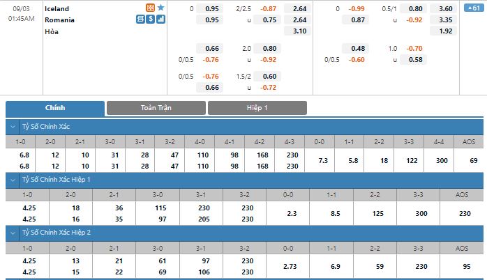 Bảng tỷ lệ kèo trực tuyến trận đấu Iceland vs Romania: